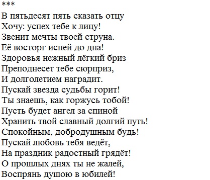 С 55-летием, дорогая мамочка. В этот юбилей я пожелаю тебе, милая, быть самой счастливой во всех ролях и статусах — счастливой мамой, женой, бабушкой, соседкой, подругой, знакомой, деятельницей и просто женщиной. Мамочка, будь здорова и любима. Желаю не знать усталости и бед, желаю в 55 раз умножить достаток жизни и радость своего сердца.